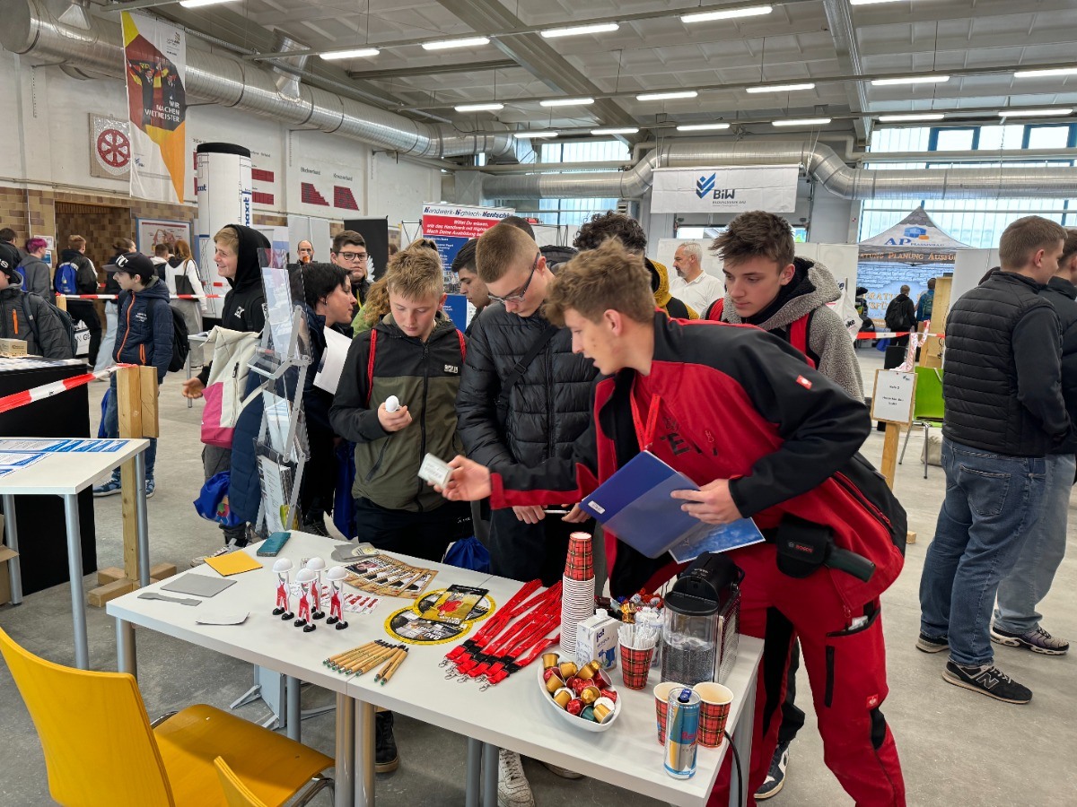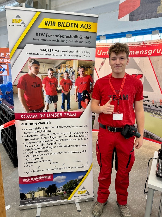 Zur Gewinn-Bau-Messe 2024 im BIW Bildungswerk BAU Hessen-Thüringen e.V. kamen über 1300 Schüler aus ganz Thüringen um sich über Ausbildungsberufe zu informieren. Für uns vertreten Paul Küthe 2. Lehrjahr.