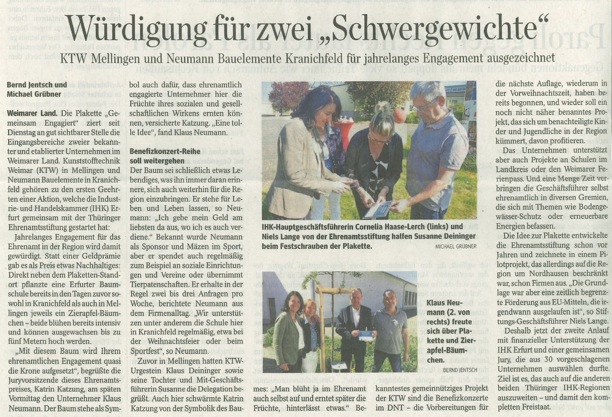 Im Zuge der Ehrenamtsauszeichnung "gemeinsam engagiert" der IHK Erfurt sowie der Thüringer Ehrenamtsstiftung wurden auf unserem Firmengelände in Mellingen ein Zierapfel gepflanzt und mit einer Plakette verewigt.
